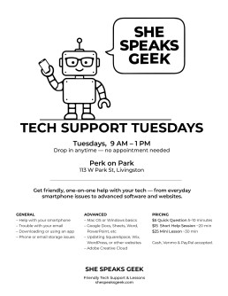 Tech Support Tuesdays at Perk on Park Get friendly, one-on-one help with your technology — from everyday smartphone issues to advanced software and websites.